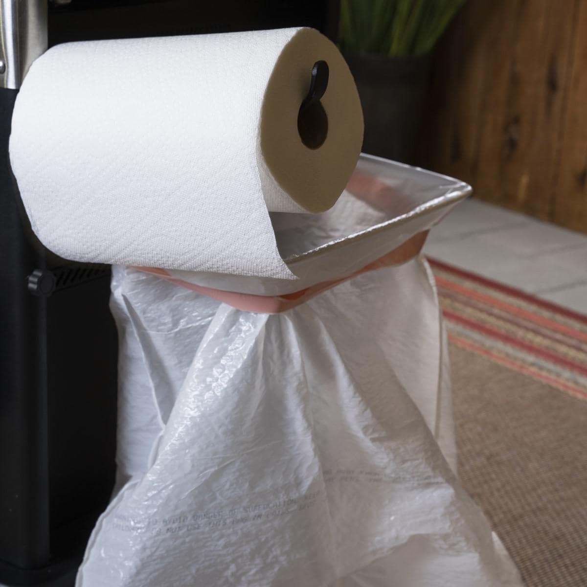 - Pivoting paper towel holder and cutting board pass-thru garbage bag holder