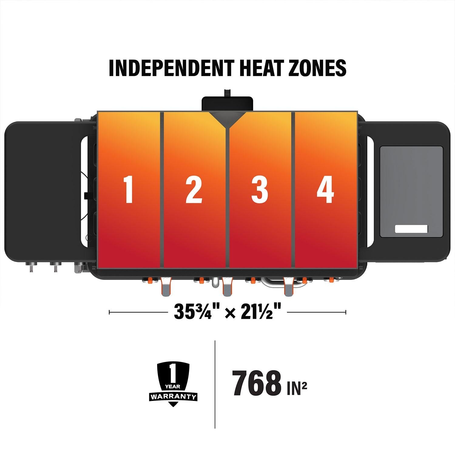 - 4 independently controlled cooking zones totaling 60,000 BTUs & 768 sq. inches of cooking space