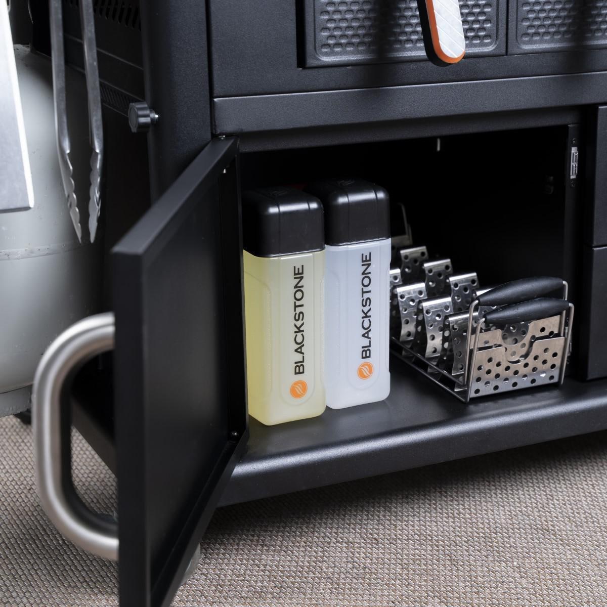Just when you thought there couldn’t be any more food possibilities with a Blackstone griddle, we went and added air fryers into the mix. Enjoy the ability to fry up some French fries and wings while cooking burgers and buns on the griddle top – the food combinations truly are endless with the Blackstone Patio 36-Inch Griddle Cooking Station and Air Fryer combo. Don’t worry about running out of prep space thanks to the large prep shelves on both side of the griddle. The right shelf even has a magnetic tool retention strip and inlaid cutting board to help save space and prepare food. With ample storage and trash bag and paper towel holders, you’ll have everything you need to griddle like a pro all in one convenient station.