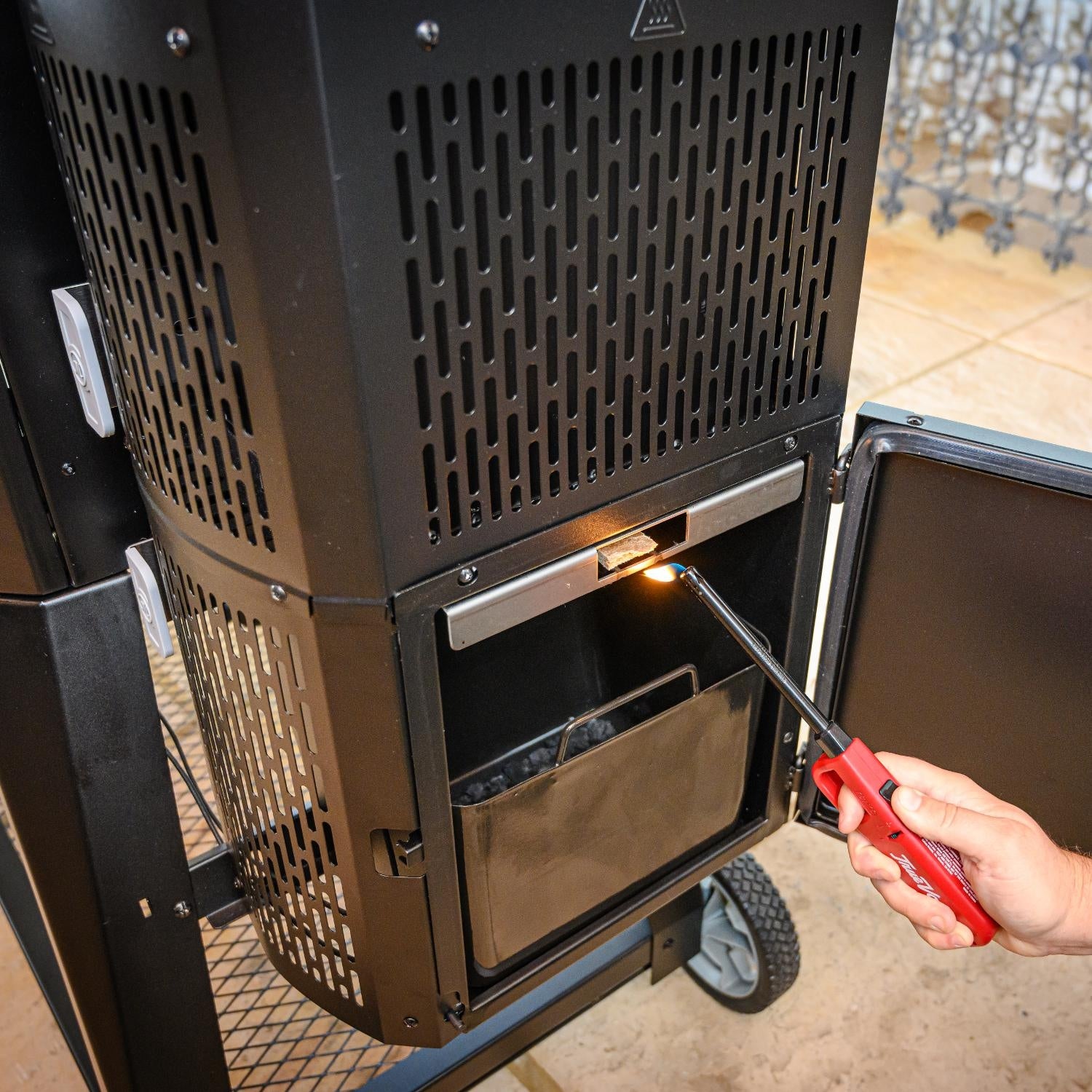 • GravityFed hopper ensures that fresh charcoal feeds the fire and ash drops into the bin below