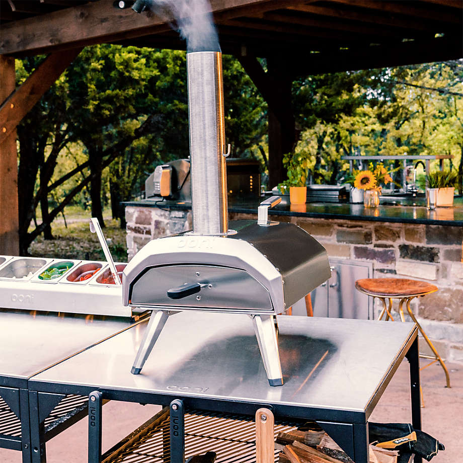 With a heating capability that rivals large professional pizza ovens, the wood-fired Ooni Karu outdoor pizza oven cooks pies to perfection at home—or anywhere—in 60 seconds flat. The oven heats to impressively high cooking temperatures in just 15 minutes powered by charcoal or wood. Or add the Karu gas burner (sold separately) to convert the oven to use propane. Retaining and diffusing heat evenly to produce ideal crusts on the baking board, the durable cordierite pizza stone stands up to high-heat cooking. This sleek carbon steel portable oven brings a dynamic, modern look to your porch, the beach or any outdoor feast.