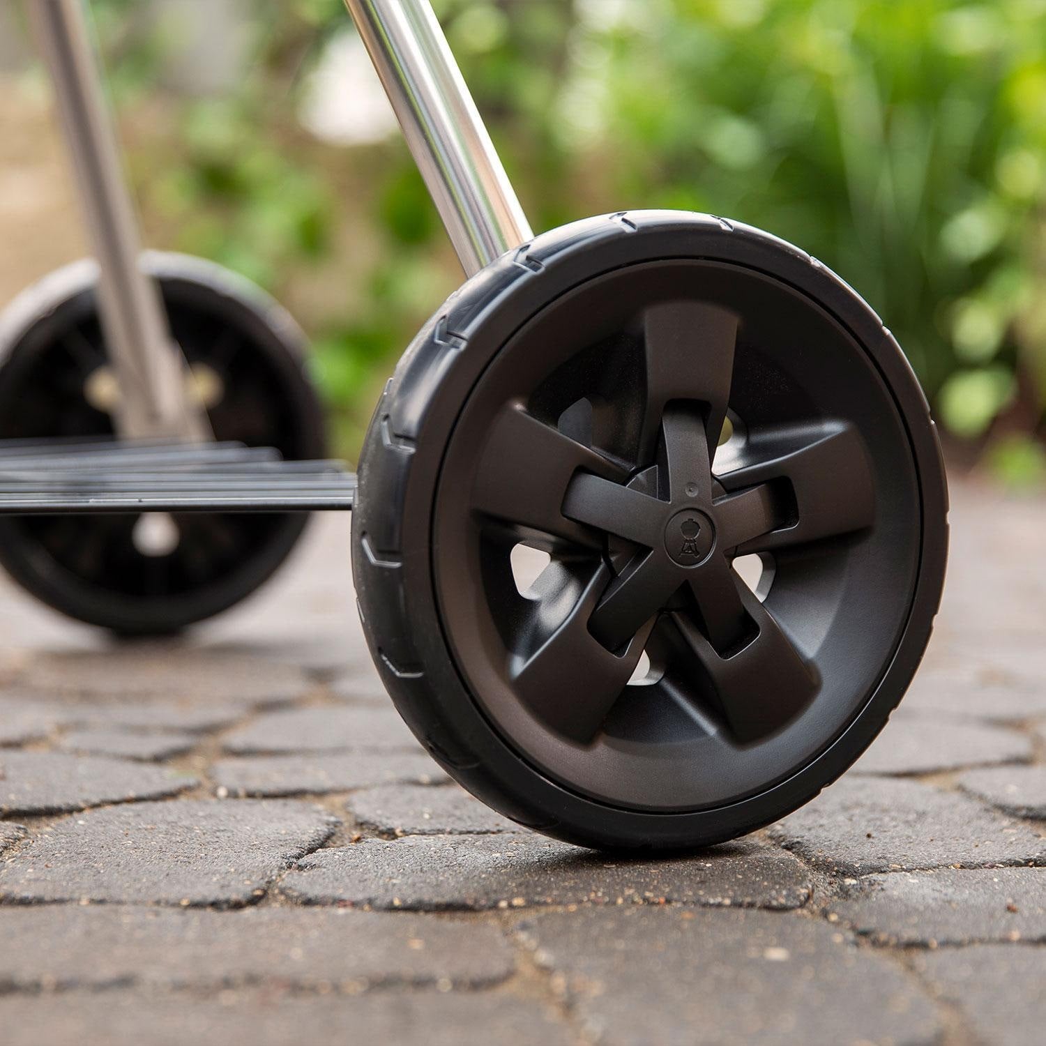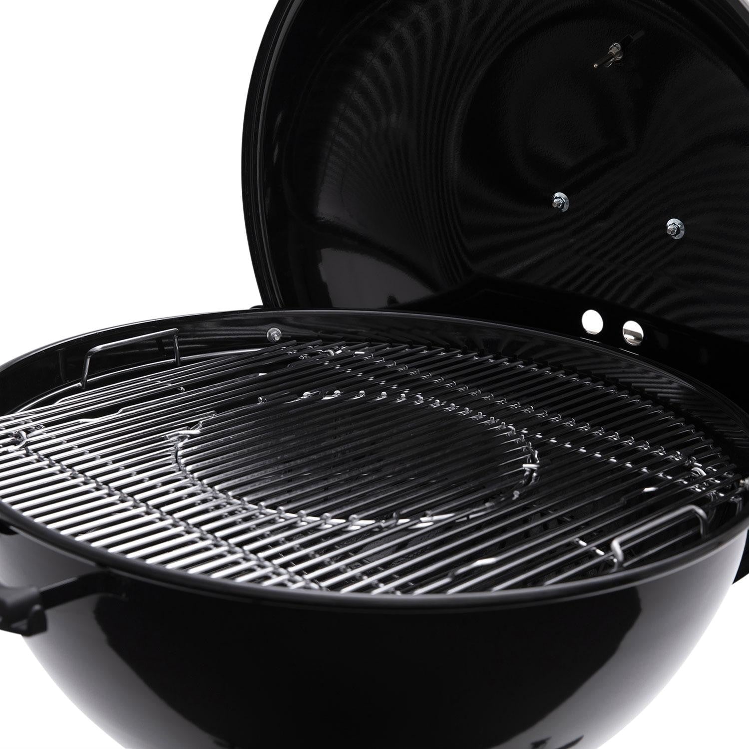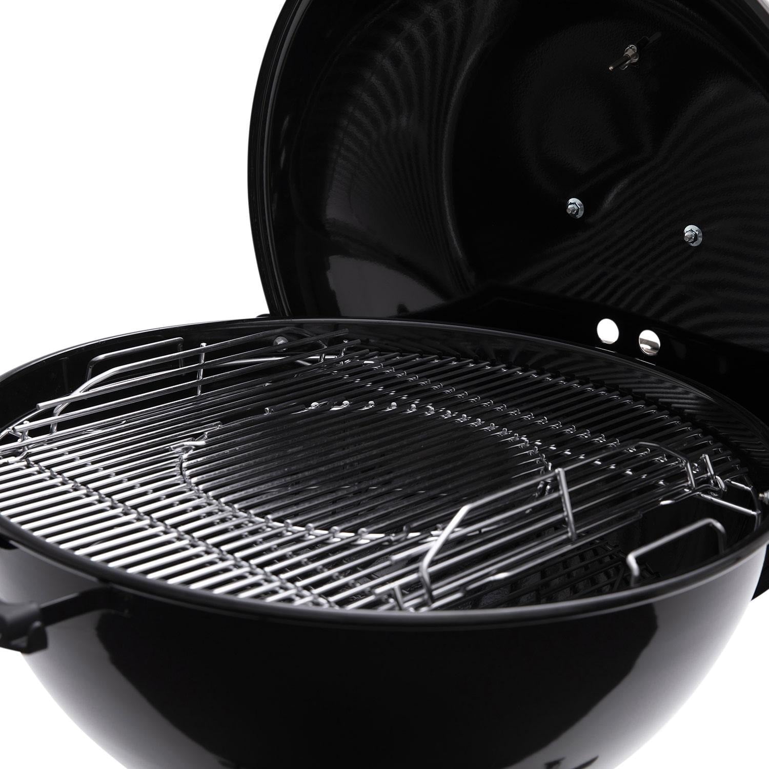 Weber combines traditional, iconic design with innovation in production in this grill that is large enough to feed the neighborhood! Made of premium-grade U. S. Steel coated with porcelain enamel inside and out, the bowl and lid of the Weber Master Touch charcoal BBQ grill are precisely formed to allow heat to circulate evenly inside the grill and across 508 square inches of cooking area. The Master Touch grill also includes a warming rack which adds 88 square inches of cooking area, for a total of 588 square inches. The black porcelain-enamel coating is baked on, fusing the finish to the steel to prevent rusting and peeling through years of use. The aluminized steel One-Touch cleaning system makes clean-up hassle free. As you rotate the handle, three blades in the bowl move ash through the vents and down into the removable, high-capacity aluminum ash catcher below, which is enclosed to prevent ashes from blowing away and creating a mess. Only the unburned coals remain in the bowl and can be re-lit for your next barbecue, which helps you save money on fuel. With the versatile Weber Master Touch grill, you have the option of direct or indirect cooking by using the two included Char-Basket charcoal fuel holders in various positions. The adjustable, no-rust aluminum top vent provides the proper airflow needed for perfect grilling and, along with the built-in thermometer, helps you to control the temperature inside the grill. This Weber Master Touch grill also features the Gourmet BBQ System hinged cooking grate that can be replaced with other components (sold separately) for more grilling flexibility. The grill also includes two glass-reinforced nylon handles that can withstand the elements for the life of the grill, one of which has built-in tool hooks, and a Tuck-Away lid holder that conveniently allows you to store the lid while you grill. Aluminum legs elevate the grill to an ideal height for grilling. This Weber grill also includes two, virtually indestructible all-weather wheels that make moving the grill easy. A classic, dependable design, the Weber Master Touch charcoal grill in black is engineered with the backyard griller in mind!