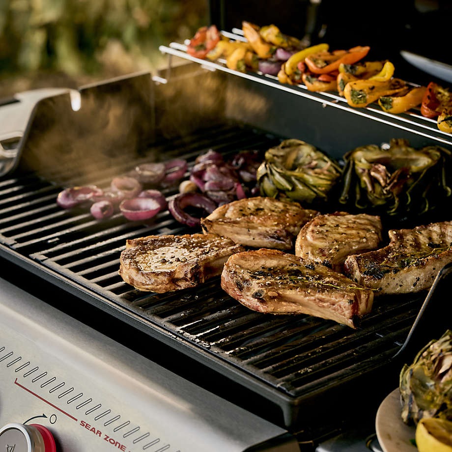 - Warming rack keeps food warm or toasts buns above main grates
