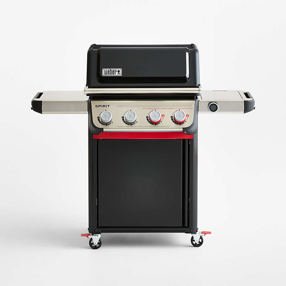 This four-burner gas grill is a backyard chef’s dream. Burgers, wings, fish and veggies grill evenly and consistently regardless of where they’re placed on the porcelain-enameled cast iron cooking grate with Flavorizer bars. Two Booster Burners unleash 40% more power in the sear zone, making it easy to create bold, flavorful sear marks on everything you grill. Snap-Jet Ignition lets you easily light individual burners with one hand, and the electronic ignition system fires up the grill quickly and reliably. A lid-mounted thermometer lets you monitor what’s cooking with a digital display that can be read night or day. Side tables provide extra room grilling supplies and pans, and a cabinet hides a propane tank and more. Finished in black with red and stainless steel accents, the grill takes pride of place on your patio or deck.